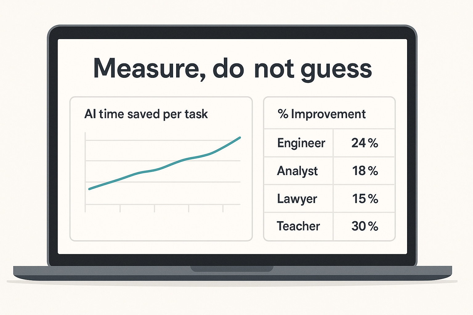 You do not need perfect econometrics. Even directional data on ten common tasks will show whether the gains you see resemble the 20–40 per cent RCT (Randomised Control Trial) world or the 80 per cent chat window world.